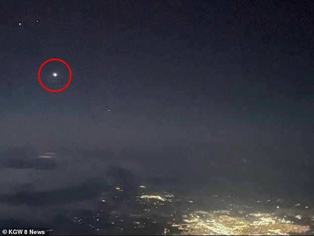 Above, a photo of two of the UFOs taken by one of the pilot witnesses. Some dedicated UFO researchers – including University of Utah mechanical engineer Dr Douglas Buettner – believe that the lights are most likely misidentified Starlink internet satellites
